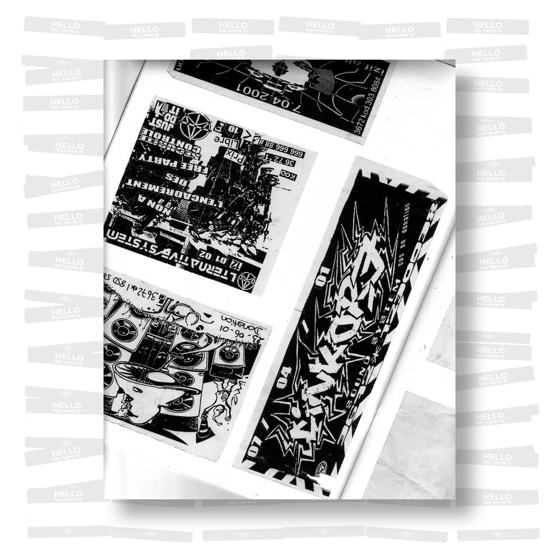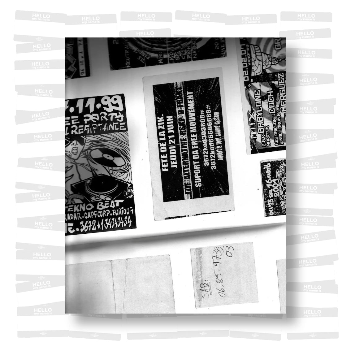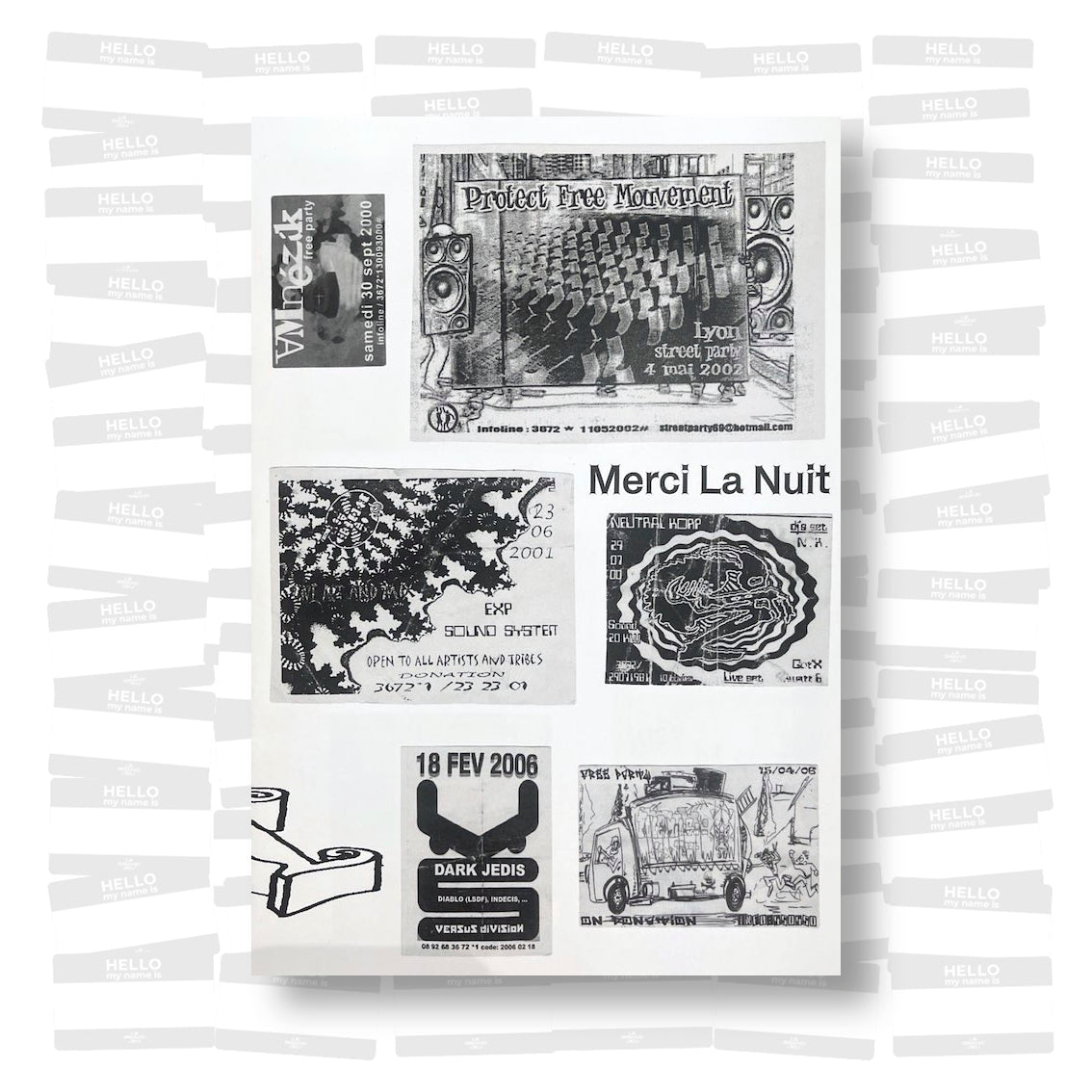 Flyers from 2000s Free Parties, private collection, mainly from Lyon Area in France. The first instalment of a series called Merci la Nuit, a graphic study started in 2013 dedicated to black-and-white flyers from illegal parties.