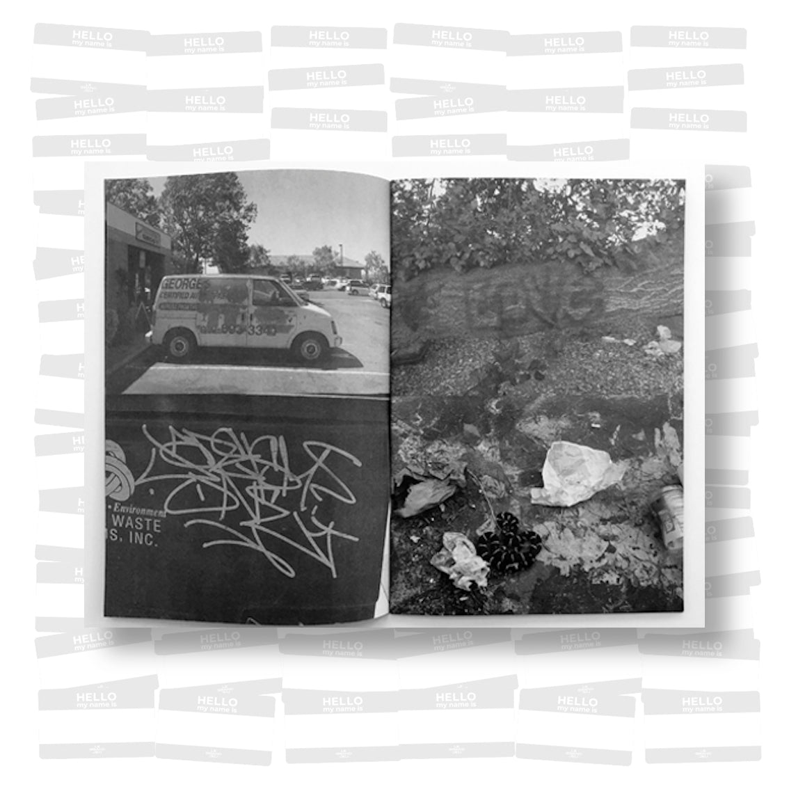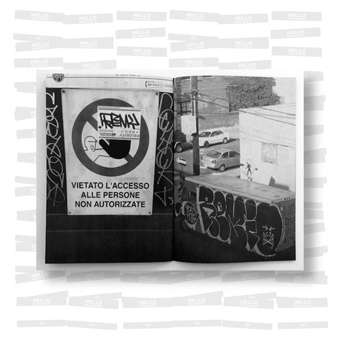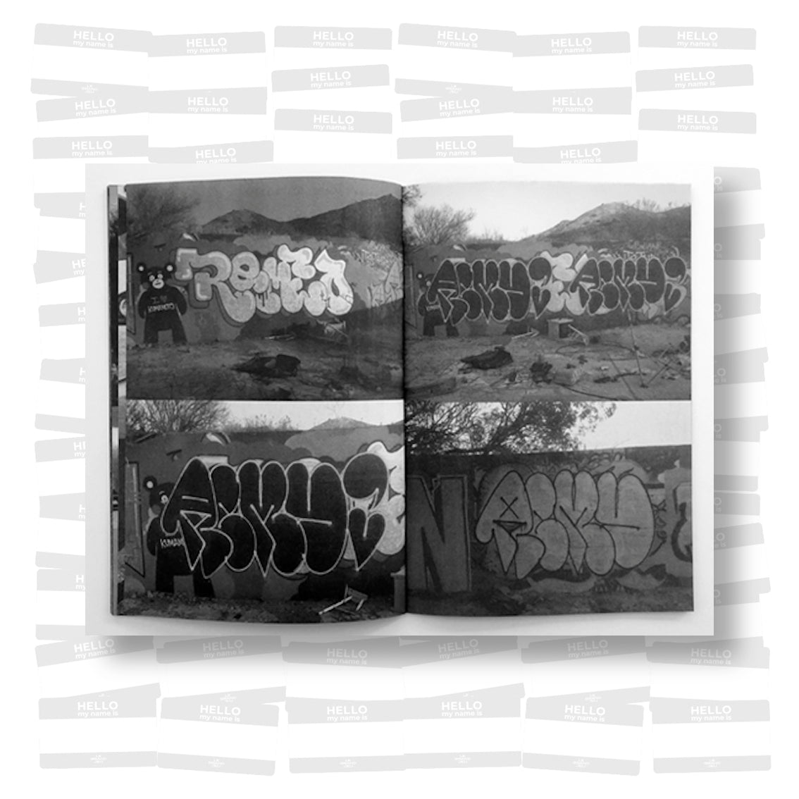 Graffiti artist Remio presents a series of black-and-white images of his work in locations ranging from the side of a truck, the support beneath a highway overpass, and a Salvation Army sidewalk sign. The variety of spaces Remio has been able to place his work speaks to the far-reaching capabilities of graffiti as a distinctly public form of art, reinforcing its nature of democratic access and dissemination.