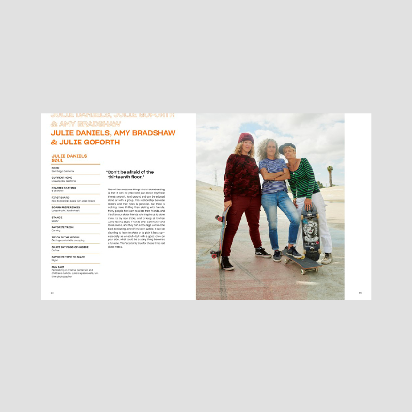 I hope that this book will inspire girls and women of all ages to follow their passions, try new things, and never feel that something is off limits because it’s “a boy thing.” Skateboarding is not just a boy thing. Girl shredders are out there tearing it up and having a great time, and this book features some of them. There are countless more ladies out there doing standout things on their boards and bringing the sport to new heights. We have only just begun.