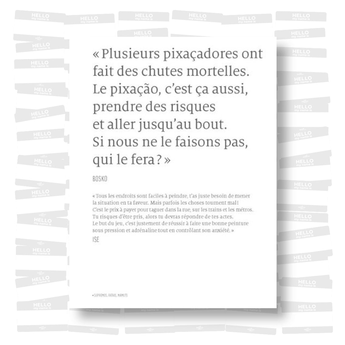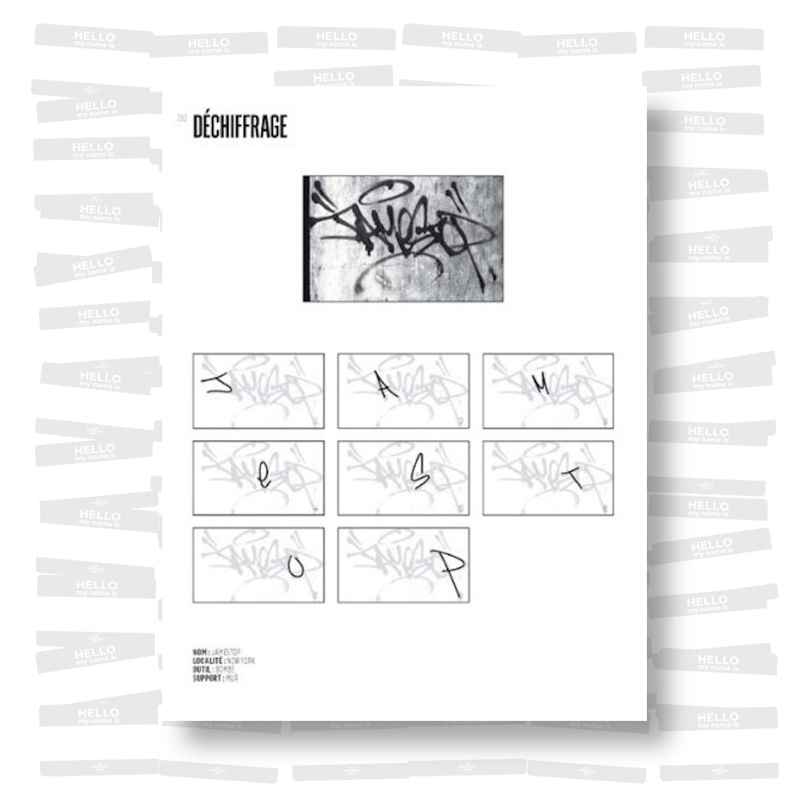 Les ouvrages consacrés exclusivement aux tags sont inexistants, comme si ce type de production, assimilé souvent à une simple dégradation, un acte de vandalisme gratuit, ne méritait pas de publication à part entière. Ces signatures, exécutées dans l’instant, écrites et non dessinées, qui ne cessent d’apparaître sur les murs, restent un mystère pour beaucoup. Le tag est pourtant l’essence même du graffiti : sa forme la plus épurée et la plus difficile relève dans certains cas d’une virtuosité digne des plus grands calligraphes.